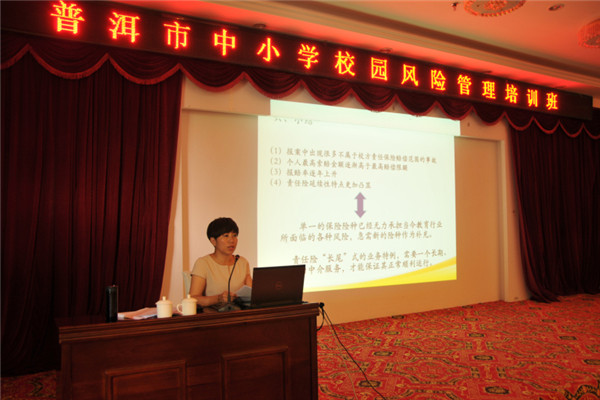 為認真貫徹落實《云南省教育廳關于舉辦中小學校園風險管理培訓班的通知》(云教函[2015]317號)文件精神,進一步加強普洱市學校安全教育和管理工作,切實提高基層學校風險防控的能力,于2015年8月25日舉辦了義務教育階段學校校園風險管理培訓班。我公司特邀請專業(yè)律師和保險專家,組成培訓小組,對參訓人員進行了培訓。專業(yè)律師和保險專家圍繞依法治校、安全管理方法、法律風險規(guī)避方法、教育風險及風險管理辦法、保險法等內(nèi)容展開了詳細的講解。我公司業(yè)務總監(jiān)羅琳對2014學年受理的校方責任保險案例作了詳盡的分析,并提出了相關風險管理建議。她指出,我省校園安全責任事故類型主要以意外傷害事故為主,因此加強安全與防范教育以及校園課間管理尤為重要?头苦嚂喳愒敿毥忉屃恕对颇鲜〗逃龔d等四部門關于加強學校保險工作的指導意見》(云教體[2014]26號)中所列的險種,并提出了相關建議。