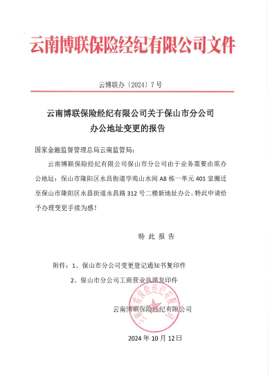 云南博聯(lián)保險經(jīng)紀有限公司關于保山市分公司辦公地址變更的報告